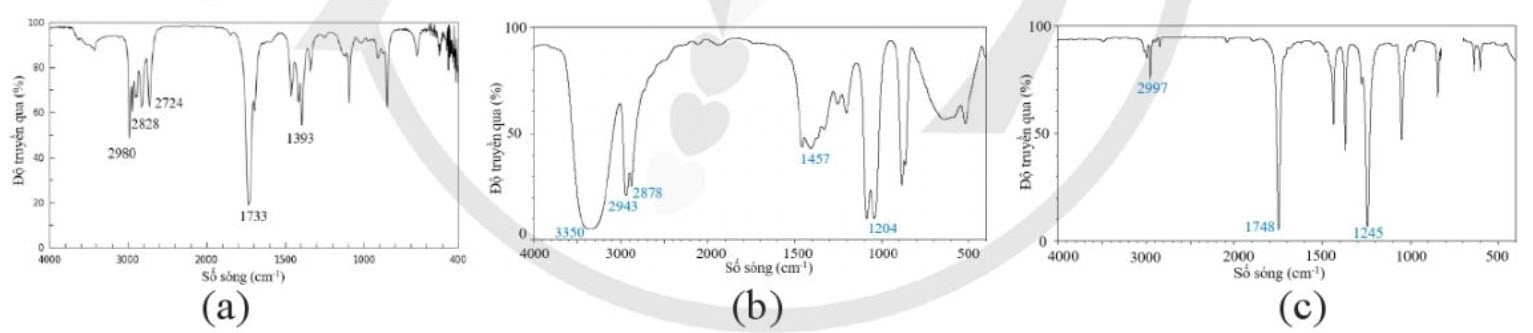 Các tín hiệu hấp thụ ở 2828 cm-1, 2724 cm-1 là đặc trưng của C – H trong nhóm ‒CHO; 1733 cm-1 là đặc trưng cho C=O của aldehyde, ketone à (2) : (a)
